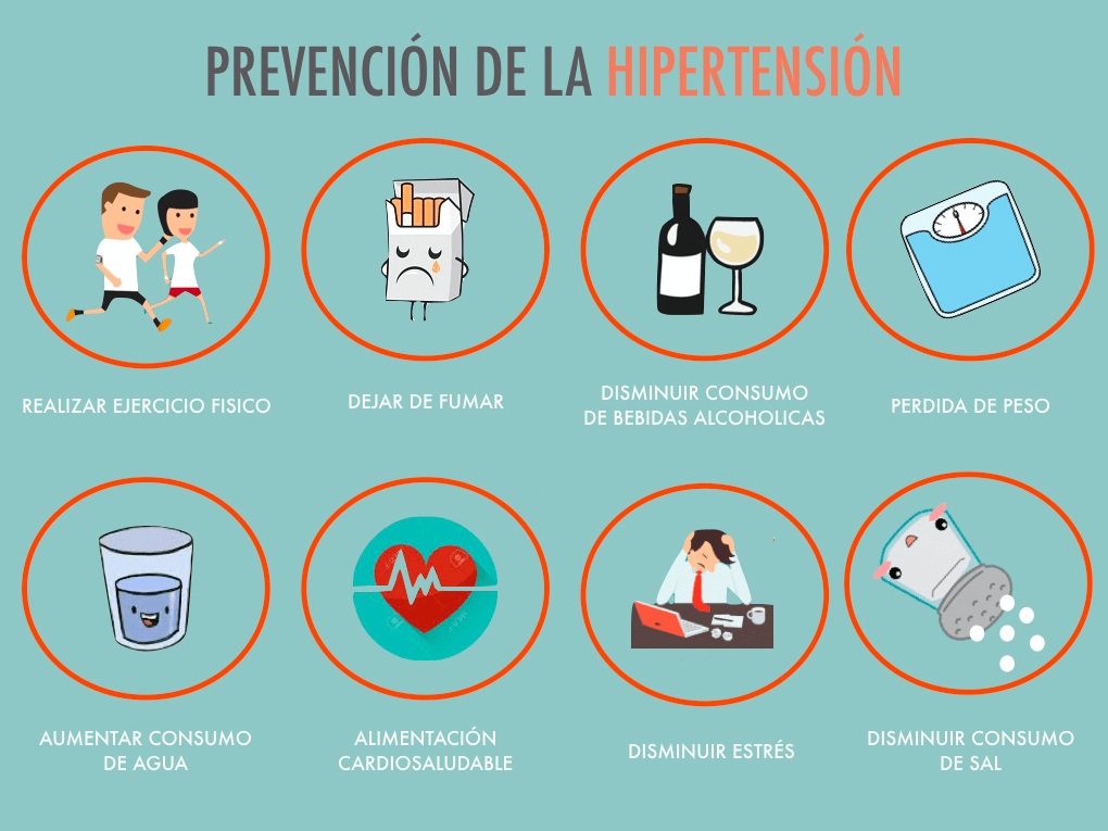 Ingerir alimentos con exceso de sal y grasas, comer pocas frutas y verduras, tomar alcohol en exceso, fumar, no tener actividad física (sedentarismo), no controlar adecuadamente el estrés.