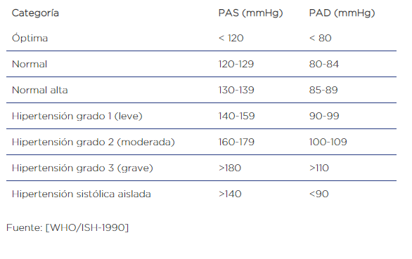 Se tiene hipertensión arterial cuando los valores de presión sistólica son mayores o iguales a 140mmHg (hipertensión sistólica) y/o cuando los valores de presión diastólica son mayores o iguales a 90mmHg (hipertensión diastólica).